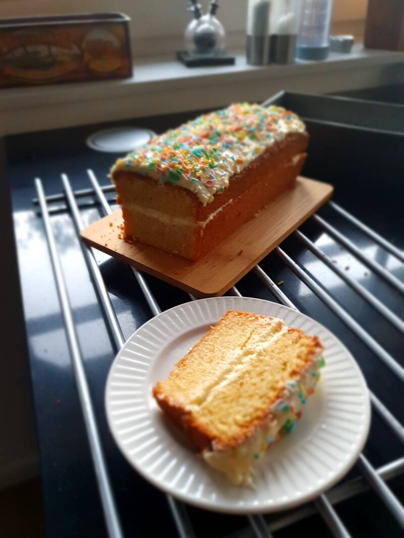 Na een baksessie van mijn dochter was er een flinke hoeveelheid frosting overgebleven. Dit was roomkaas met poedersuiker en roomboter. Zonde om weg te gooien. Daarom heb ik een doodgewone cake gebakken. Die even doorgesneden om er een laag frosting tussen te doen en nog een laag bovenop de cake en een beetje versierd met wat sprinkels die ik nog had. Simpel en toch erg lekker.