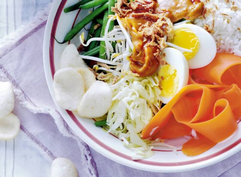 7 Leg de groenten, eieren en taugé op een schaal. Schenk de hete pindasaus erover. Serveer met de rijst en gebakken uitjes.